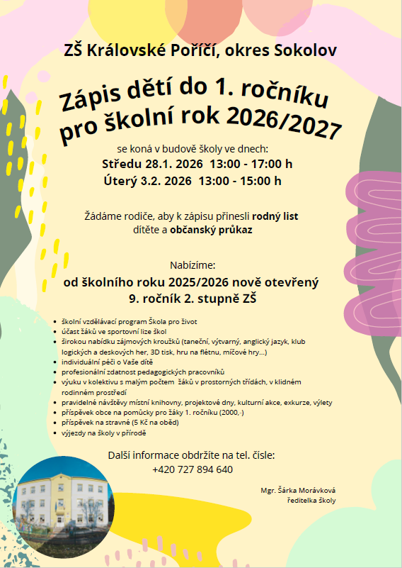Zápis do 1. ročníku pro školní rok 2026/2027 proběhne v budově ZŠ Královské Poříčí, Dlouhá 63, dne 28. 1. a 3. 2. 2026.